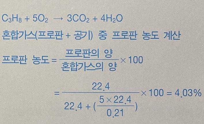 12. 프로판을 이론공기량으로 완전연소할 때 혼합가스 중 프로판의 농도 (%)는 얼마인가? (단, 공기 중 산소와 질소의 체적비는 21 : 79이다)