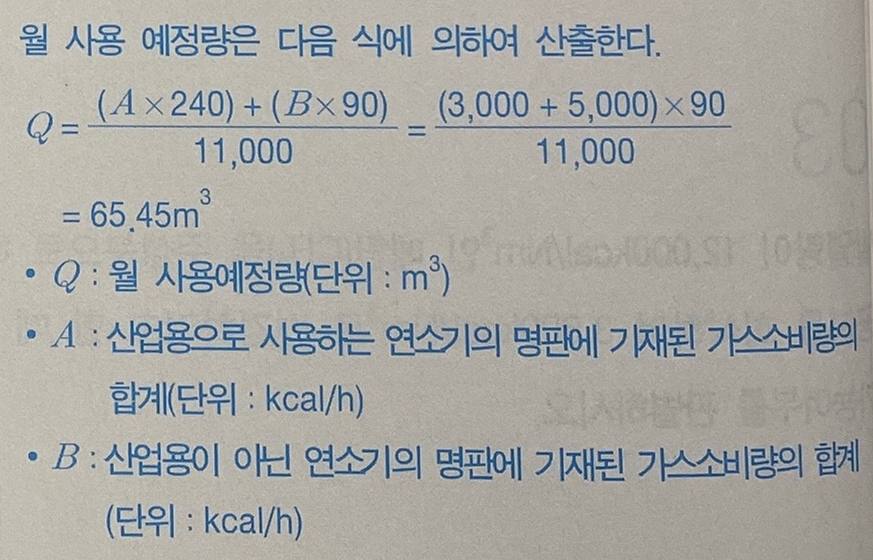 7. 음식점에서 사용하는 연소기구의 연소가스량이 3,000kg/h이 고, 온수기의 연소가스량이 5,000kg/h일 때 도시가스 월사용 예 정량(m3)은 얼마인가?